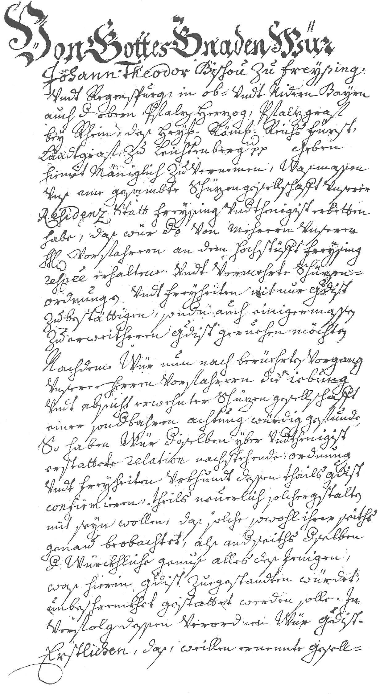 Von Gottes Gnaden WürJohann Theodor Bischof zu Freysing ect…….. geben hiermit mäniglichen zu vernehmen, wasmassen vnns die samentlichen Schützen vnnserer Grafschaft Werdtenfels vnnderthennigst erbetten haben ,daß wür nicht nur dero yder Menschngedenkhen hergebrachte Ordnung und Satzungen, sondern die bereits ao. 1735 in lobwürdigem St. Petri et Pauli Gottshaus vnnd Pfarrkürchen zu Mittenwalt unter dem mächtegen Schutz und Titul des hl. Martyrers und Nothelfers Eustachii aufgerichte Schützenbruderschaft gnädigst zu bestätigen, auch einiger maßen zu erweithern gnädigst geruhen möchten undweilen sie danach denen von uns einergesambten Schützengesellschaft unserer Residenz Statt Freysing vom 4. März 1736 verliehen und de novo confirmierten Saz- und Ordnunggen, auch erteilen Privilegien allerdings nahzuleben und nach selben als ihrer vorgesetzt, ordtenlicher Schützenhauptlad in allen puncten. Vunnd Vorvallheiten sich zu regulieren erbotten haben, so haben wür derselben nachstehenden Ordnung und Freiheiten vrkhundt dessengndst. Konfirmiern und erteilen wollen, dass solche vonihnen genau beobachtet werden sollen. In Verfolg dessen verordnen wür gdst.